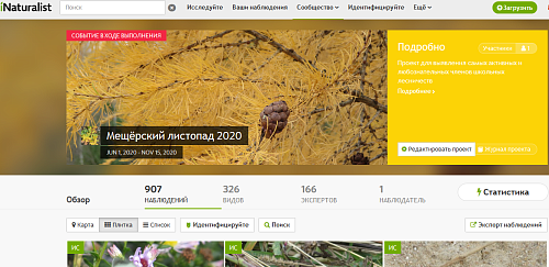 На платформе iNaturalist стартовал проект "Мещёрский листопад - 2020", который призван определить самых активных членов школьных лесничеств: . Задача достаточно проста - сфотографировать и определить как можно больше видов представителей различных групп живых организмов (растения, насекомые, птицы, грибы и т.д.). Сейчас там для образца мои наблюдения, но скоро я их выключу, дабы не смущать участников.